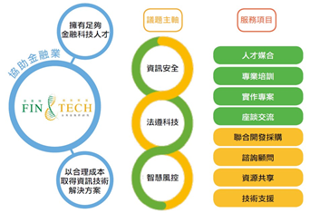 「芬恩特」既以金融業的需求為出發點,考量到國銀在推展金融業務上各有所長,為求取會員機構的最大公約數,「芬恩特」初期將以「防禦型」的「基礎建設」為重點,探討議題圍繞在「資訊安全」、「監理(法遵)科技」、「智慧風控」等3大主軸。「芬恩特」期望能藉由專業培訓、實作專案、座談交流與人才媒合,協助會員機構擁有足夠的金融科技人才;同時透過聯合開發、聯合採購等做法,協助會員機構以合理成本取得資訊技術解決方案。