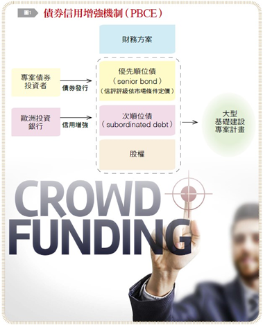 第一類優先順位債在企業破產清算時需優先償還債務,其安全性較大,利率較低,在有企業資產擔保前提下,一般的專案風險較小,雖收益率低,但相對的發債成本低廉;針對第二類次順位債券,在歐盟委員會及歐洲投資銀行的協力支持下在專案計劃啟動時,將經由商業銀行提供額外一筆貸款給專案開發商,推動進行專案債券信用增強機制(project bond credit enhancement; PBCE),在該方案中,若專案所產生的收益現金流不足以支應次級債務負債應付必要支出時,將可經由另提應急信貸額度(contingent credit line)方式對專案做緊急融通處置,以確保專案債務不致產生違約,針對次級債務所設計的專案債券信用增強機制(PBCE)足以有效強化財務方案中的債務信用品質,提供機構投資者充分的保證機制,大幅提升外部投資人出資投入於專案的意願,在上述財務架構設計中,專案債券本身由專案開發商視專案需求而規劃發行,而非由商業銀行主導發行,在專案執行期間可透過債券信用增強機制(PBCE)來提供充足及完整的債務信用擔保,包括整體專案在期初資金需求最殷切的工程興建開發階段。