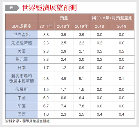 筆者再次引用國際貨幣基金組織(IMF)4月17日最新發表的《世界經濟展望》資料,該報告認為發達經濟體今年與明年將繼續以超過潛在成長率的速度擴張,隨後將趨於穩定;新興市場和發展中經濟體的成長將加快,隨後趨於穩定。詳細的數據資料請參考表一,國際貨幣基金組織預測2018年全球經濟成長率為3.9%,2019年亦是3.9%。