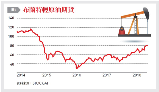 2018年第三季另一個必須觀察的商品走勢則是原油價格。按照過往經驗,原油價格在夏季用油高峰結束之後就會進入修正,例如2014年至2016年〔請參考圖二〕,但是,去年夏天之後,原油價格呈現一路走高。原油價格看回不回的原因很多,例如OPEC延長減產、美國決定退出伊朗協議並重啟經濟制裁、歐美聯軍對敘利亞軍事轟炸、委內瑞拉原油產量下滑等,刺激原油價格上漲的政經事件最近一年持續出現。據媒體報導,OPEC最大會員國沙烏地阿拉伯認為油價到達每桶US$80才能滿足沉重的國內支出負擔。