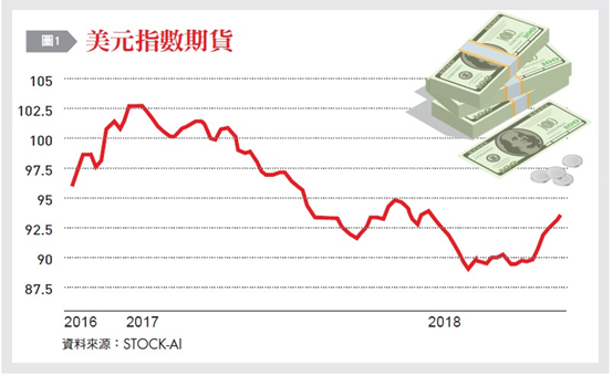 第三季金融市場上有兩項商品走勢值得觀察,第一是美元走勢。自從2016年11月唐納․約翰․川普(Donald John Trump)當選美國總統之後,美元走勢非常疲弱﹝請參考圖一﹞,美元指數從2017年1月最高103.85一路下跌至2018年2月最低88.15。2018年隨著美國國債收益率上揚,以及中美貿易摩擦舒緩,美元指數自4月17日低點反彈至5月底已經站上94,漲幅超過5%,為2015年底以來最大漲幅,其他主要貨幣如歐元、日圓兌美元均呈現大幅貶值。