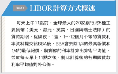 何以至此?主要是LIBOR問世時,銀行業仍算是誠信至上的時代,沒有人想到利用操弄這項基準利率獲利。但數十年來,日新月異的新金融商品複雜度大增,LIBOR的計算方式卻幾乎沒有改變(見BOX1),遂衍生出兩個極為顯著的問題:一是無法保證銀行報價的