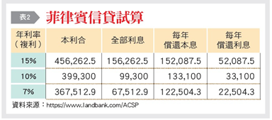 以菲律賓農業為例,菲國利率固然很高,大約在8.5%到15%之間。這對銀行業者固然是利多,但利率之高其實是菲國小農無法承擔。以貸款300,000(折合新台幣約171,428.57元),3年償還,各以 15%、10%、7%、5%複利進行計算,可以得出表2。