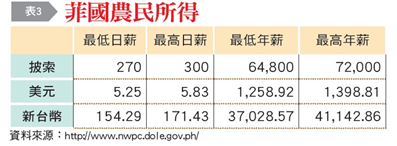 但菲國農民的所得是否能承擔得起這樣的還款計劃呢?我們根據菲國農民收入加以計算,情況顯然不是那麼樂觀。表3是收入最高的Cordillera地區農民情況。純就銀行短期獲利的要求而言,菲國農民所得難以支撐高額利息,顯然不是一個理想的融資區塊。可以想見菲國小農或中小企業也跟台灣早期一樣,融資取得困難。但這種「艱困」地區卻正是新南向平行外交最值得開發的地方。當然如果要開展這方面的工作,一定要將其他利害關係人,也就是當地中央、地方政府,以及銀行業者一起納入協商過程,把它作為個國家發展計劃來進行。台灣目前新南向政策最大的問題就是政府單位與相關智庫不能深入在地脈絡,只以慣性思考,把原先西向模式拿來做南向工作,這就完全喪失了新南向在這個區域結構轉型的戰略意義了。(本文作者為中山大學社會系教授)