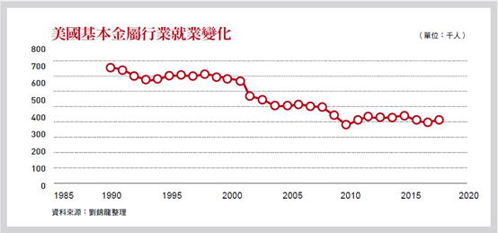 以美國鋼鐵業所屬的基本金屬行業為例,根據美國勞動部公佈的資料,在1990 年時就業人數約700,000人,但到了2017年則下降至400,000人,而下降最快的期間就在2000年至2010年這10年間,一度由630,000人降至340,000人,就業減少達到近300,000人,減少的比率達到43%,快速的就業減少進而產生眾多就業與社會問題。然而,由經濟學家的觀點,美國鋼鐵業的蕭條並不純粹是因為這個產業的生產力低落而造成的結果。美國杜克大學的Collard-Wexler教授與普林斯頓大學的De Loecker教授在2015 年於著名美國經濟學術期刊《美國經濟論叢》(American Economic Review)發表學術論文,討論美國鋼鐵業由1963 年到2002年的40年間發展過程,發現在這段期間就業人數減少400,000 人,相當於75%的就業量,但因為生產技術的創新,鋼鐵業的生產總值,以1987年的金額計算,在1980年至2000 年間,仍由US$400 億上升至US$500 億。換言之,勞動生產力在同時間增加5倍,讓美國的鋼鐵業成為繼電腦軟體與設備業,為同期間發展最為快速的製造業。這段期間美國鋼鐵業的生產力快速成長與伴隨的就業量減少,並非來自於全球化的影響,而是來自於新的電爐煉鋼技術創新取代了無效率的垂直整合高爐煉鋼生產方式。