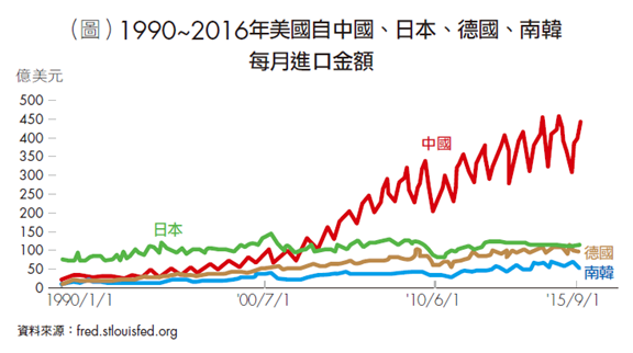 附圖是美國1990年至2016年間每月自中國、日本、德國與南韓4個國家的進口金額。在這26年間,美國自日本每月進口金額的變化並不太大。德國與南韓兩國金額變化雖然比較大,但若與中國相比較,這些國家的變化幅度則相對為小。美國自中國每月進口金額的急遽上升則是自2001年中國加入世貿組織(WTO)之後發生。