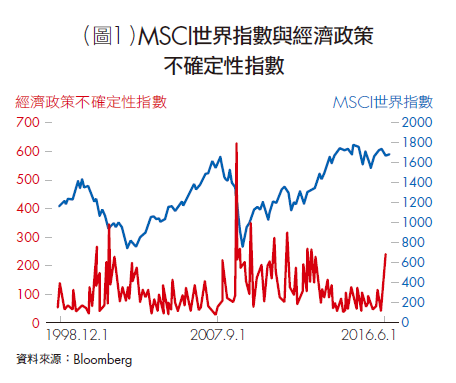 理論上,政治事件或局勢改變必將使國際政治板塊與相應的經濟政策產生位移。但大多數政策改變至產生效力,都有相當長的時間落後性,如財政政策的效力便需約1年後才會有效顯現,且有些時候政策的時間落後性更長。諾貝爾經濟學獎得主克魯曼(P. Krugman)便曾指出,1980年代後美國全力進行金融去管制的最大副作用,便是2008年美國次貸風暴。正因如此,檢視歷史資料才會得出,短期內政治事件與金融市場關聯性不大的結果。如1999年1月至2016年11月MSCI世界指數與經濟政策不確定性指數的相關性僅有-0.30(詳見圖1)。