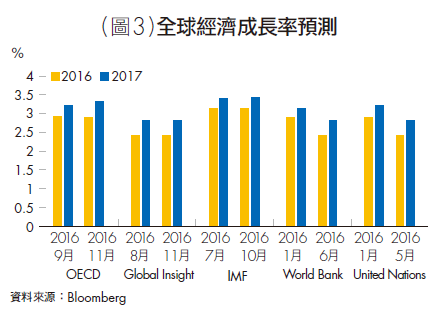 再者,能夠預示未來景氣狀態和走向,與金融市場關係密切的OECD領先指標又維持上揚趨勢,暗示未來一段時間全球經濟復甦的能見度仍在,經濟成長有進一步加溫的空間(詳見圖2),亦即客觀的高頻經濟數據大致指向:2017年全球經濟可望較2016年加速。於是,隨著時間的推進,國際主要機構對2017年全球經濟的看法更為樂觀,10月、11月IMF及環球透視(Global Insight)維持2017年經濟成長率預測值,OECD的預測甚至還上修0.1個百分點至3.3%(詳見圖3),顯見景氣前景可望漸趨光明。