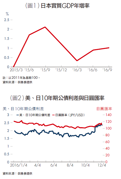 「日本經濟已經出現站穩味道,」李勝彥形容,2016年對日本是慢慢啟動的一年,經濟逐步成長,因此,只要安倍經濟學刺激得當,加上川普經濟學若能成功刺激美國通貨膨脹成長、經濟復甦,也有利出口導向的日本經濟,「預料2017年對日本,有機會屬於保溫、維持熱度、增強體質的一年。」