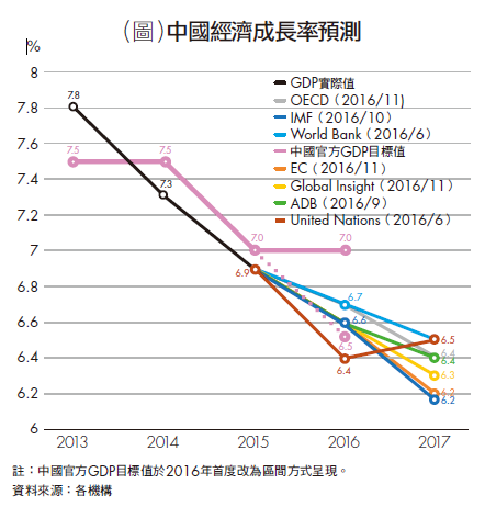鑑於前述3股下拉力量的影響,2017年難以看到令人欣喜的中國經濟成長數字(詳見圖),經濟政策的核心思維,也將從2016年的「穩增長」,明顯傾向「調結構」,但此一轉變未必不是好事,且撇開數字不看,2017年中國經濟仍有3個值得關注的亮點。