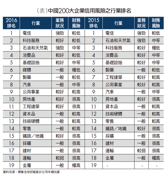 中國企業面臨的問題還尚未結束。我們預計2016年中國大型企業的信用狀況將繼續惡化。標普全球評級(S&P Global Ratings)對中國200大企業的年度研究顯示(編按:針對2016年中國200大企業所做的信用結構研究。這200家企業選自19個主要行業,均為行業中的龍頭或最大借款機構,其信用風險的行業排名詳見附表),由於需求和定價疲弱,所產生的拖累超出了成本和資本支出減少的影響,導致國有企業的財務槓桿繼續上升。國有企業在樣本公司中的占比約為70%,在總借款中的占比則達90%。