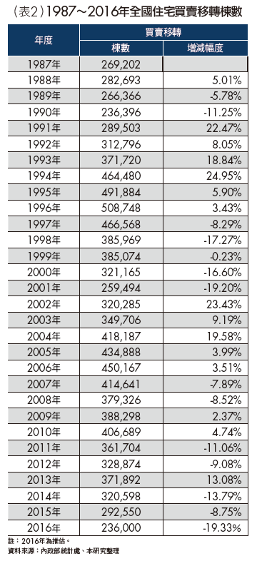 根據內政部所公布之最新統計數據,2016年1至10月197,039棟之買賣移轉數量,相較於2015年同期的220,735棟減少23,696棟,且僅為2015年同期的89.27%;其次,若以1至10月買賣移轉棟數推算,2016年總交易數量可能只有23.6萬棟之譜而創25年新低。