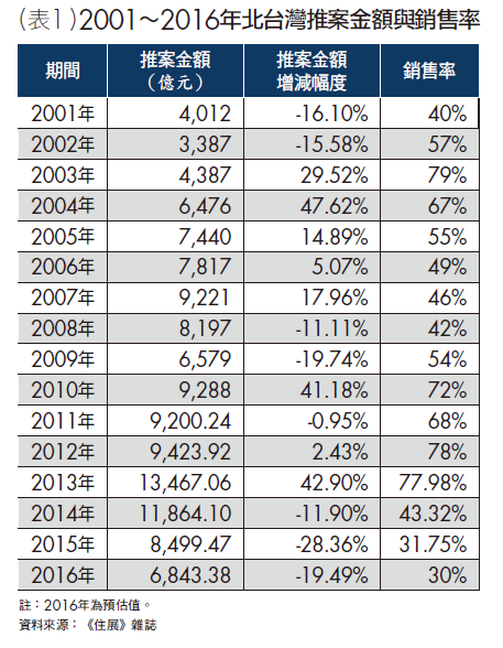 首先,就《住展》雜誌之北台灣預售與新成屋統計數據,推案金額由2013年之13,467.06億元逐年下降至2016年之6,843.38億元,並且銷售率亦由77.98%大幅降至30%(詳見表1)。