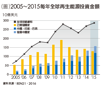 在各國積極推動減碳政策下,2015年到2040年全球對發電方面的投資,將有高達60%投入再生能源,全球性的能源轉型正在進行,再生能源有機會成為全球主要電力來源。
