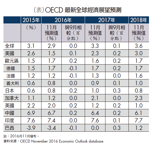 台灣銀行業方面,預測聯準會2017年第一次升息最有可能是落在6月,2017年獲利可望增添新動能。以國銀外幣放款規模約5,760億元計算,2016年至2017年底前預估增加0.6%的存放款利差,2017年外幣放款淨利息收入可增加約15.1億元;若我央行停止降息,台幣存放款利差可帶動向上拉高到1.5%以上,則台幣放款淨利息收入估計可增加231.7億元,加上2017年經濟展望轉佳(詳見表),手續費收入與景氣連動性高可望成長,國銀整體獲利相較2016年將有較明顯的提升。(本文作者為台灣金融研訓院金融研究所副所長)