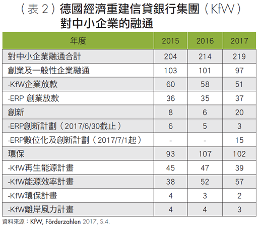 德國聯邦經濟暨能源部(Bundesministerium für Wirtschaft und Energie, BMWi) 為主要主管, 主要透過1948年實施歐洲復興計畫(European Recover y Programme, E R P,即馬歇爾計畫)的經濟重建信貸銀行集團(Kreditanstaltfür Wiederaufbaum, KfW)轄屬之中小企業銀行(KfW Mittelstandsbank)的融資補助方案,以及聯邦中央創新計畫來提供中小企業創新的融資協助(ZIM)。