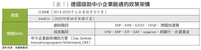 德國中小企業的融資主要由歐盟及聯邦經濟暨能源部(BMWi)主管,結合歐盟的歐洲社會基金合作,在企業創始期及茁壯期各有融通政策工具。