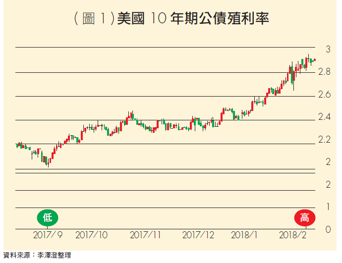 經濟成長趨勢在2018年繼續蔓延於全球各區域,當然,世界第一大經濟體美國的經濟狀況更是市場關心的重點。從美國最新公布的總經數據,1月份失業率為4.1%、1月份ISM製造業採購經理人指數59.1、1月份平均每小時薪資年增率2.9%,也同樣繳出亮麗的成績單,投資機構多樂觀看待2018年美國經濟表現,不過,進入2018年之後,華爾街也擔憂薪資增長超過預期,通膨率上升加速將逼使美國聯準會(FED)加快升息腳步,此也導致2月美國股市大幅回檔。因此,2018年通膨與利率走勢將是影響股市的最大變數,每一次經濟數據公佈時都要深度觀察。