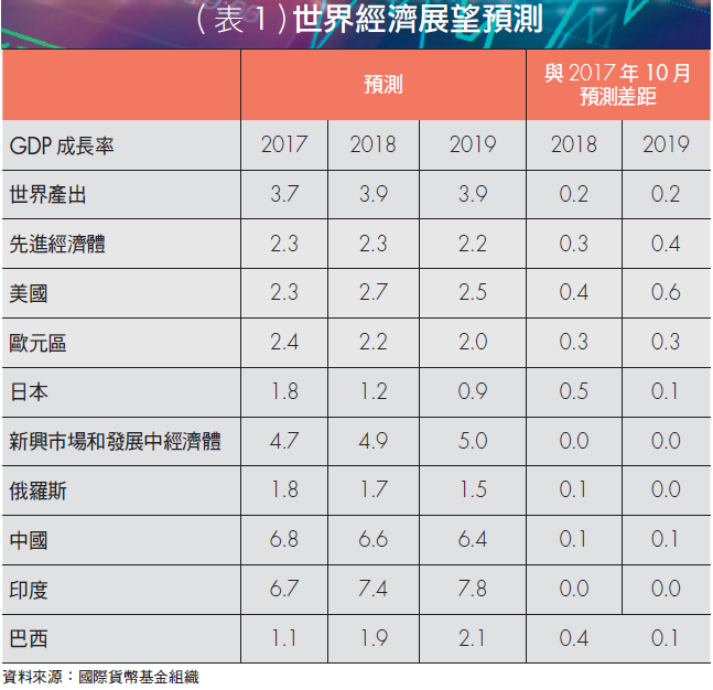 自2016年12月美國聯準會開始升息之後,無論是先進經濟體或新興市場,每一季所繳出的總經數據都令市場感到振奮。例如筆者長期追蹤國際貨幣基金組織(IMF)的《世界經濟展望》報告,最新的報告依舊聲明全球經濟活動穩固,估計2017年全球經濟成長率3.7%,較2017年10月的該組織的報告增加0.1%,另外,也上調了2018年與2019年的經濟成長率0.2%(請參考表1)。