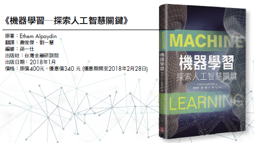 近期出版的《機器學習─探索人工智慧關鍵》,在不需鑽研複雜的學習演算法的前提之下,引導讀者瞭解機器學習的基本知識概念。全書共分為七章。