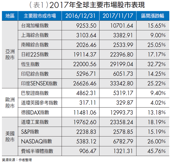 2017年已接近尾聲,投資人也將開始計算今年在股票市場的投資報酬率,在今年年初,若告訴投資人今年全球股市會一路上漲,能接受的恐怕寥寥無幾,但這就是市場,總是朝多數人認為不可能的那個方向走。
