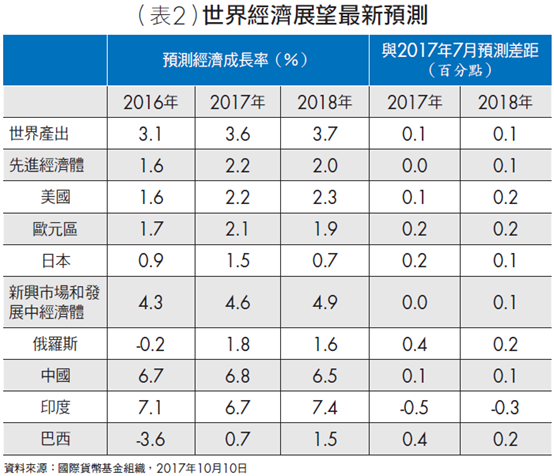 根據筆者長期研讀國際貨幣基金組織的《世界經濟展望》文章,2016年中之後,國際貨幣基金組織開始指出全球經濟進入復甦週期,進入2017年,該組織的看法更加樂觀,數度指出世界經濟復甦力道不斷增強。以2017年10月所公布世界經濟展望最新預測之數據(詳見表2),以全球經濟成長率為例,相較7月時預測的2017年3.5%及2018年3.6%,已經上調至2017年3.6%,2018年3.7%,分別上調0.1個百分點。