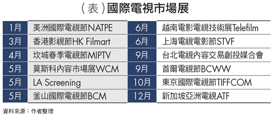 影視市場展屬於B2B的影視作品交易場所,近年為了提升國家品牌形象,各國各大城市都有一個屬於自己的影視市場展(詳見表),但背後的目的略有不同。例如東南亞國家的影視節目外銷機會較小,因此重點放在增加引進國外合製的機會,以提升本國的影視製作人才能力,增加產業業者交易的機會,另一個目的就是提高國家能見度,增加軟實力的影響力。台灣也應有一個穩定及永續的機構,將參展、辦展規劃得更加完整,而以目前用採購案的方式來看,較難有明顯的效果。