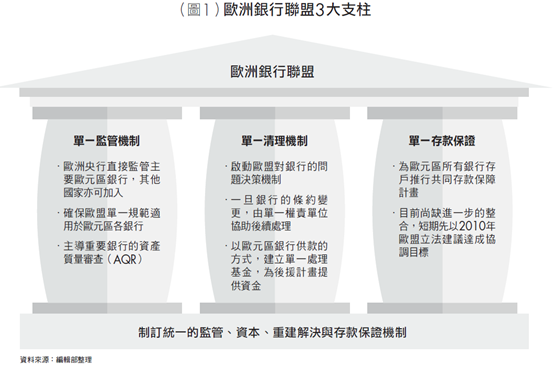 綜觀歐洲各國日益重視銀行的監管政策,歐盟推動銀行聯盟(Banking Union)3大支柱,即分別為由歐洲央行實施銀行監管準則、處理問題銀行的中央機制,以及共同存款保證制度(詳見圖1),盼達到兼顧歐元區金融自由化與穩定安全的雙重目標,實施過程面對重重挑戰仍有待整合。