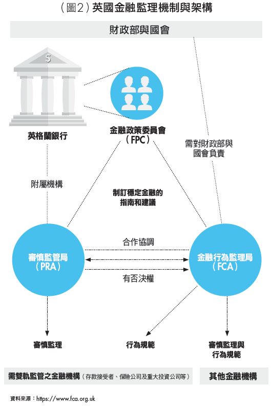 作為全球金融中心的英國,為穩定金融環境與發展,自2013年4月1日啟動新的金融監理制度,由英格蘭銀行作為監理架構的中心,並於其理事會下新設金融策委員會(Financial Policy Committee, FPC)專責總體審慎監理,負責確保英國金融體系的穩定性,以及評估系統風險。同時,新成立審慎監管局(Prudential Regulation Authority, PRA)及金融行為監理局(Financial Conduct Authority, FCA),採行雙軌模式,由審慎監管局主導個體審慎監理,金融行為監理局則負責金融市場行為規範(詳見圖2)。
