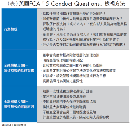 PRA負責確保存款接受者、保險公司與少數重要投資公司的有效審慎監管,以促進金融機構的安全與健全,避免任何對金融穩定的不利影響,並盡量減少由於金融機構經營業務所導致的金融服務缺失,進而達到有效競爭為主要目標。另一方面,FCA則確保相關市場運作良好的戰略目標,適當保護消費者權益,增強對英國金融體系的信心與完整性。然而,為使法令遵循與業務推展取得平衡,2015年FCA制訂「5 Conduct Questions」檢視方法(詳見表),提供金融機構執行監督的一致性的框架與方向,促使金融機構提高內部行為風險意識,進而建構有效改善戰略,此外亦能夠藉此蒐集各金融機構的反饋意見,一併將有效的解決方法提供給相關同業參考。