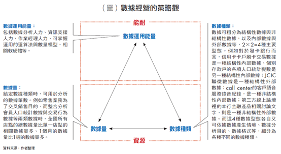 首先,就營利組織而言,被喻為未來經營燃料的數據,如上圖所示,一方面是一種資源,包含「數據種類」與「數據量」等2個主要面向。另一方面,則是一種能耐,涉及數據取得、彙整、建模、運算與解讀等相關環節,以下統稱其為「數據運用能量」。