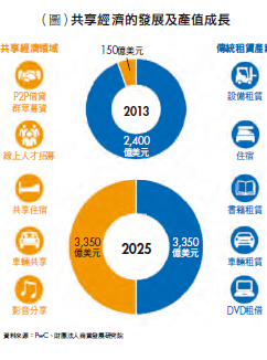 根據PwC的估計,共享經濟的全球產值由2013年的150億美元,在2025年將增加到3,350億美元,與旅館、租車、租DVD、租工業設備等租賃產業的產值差不多(詳見圖)。