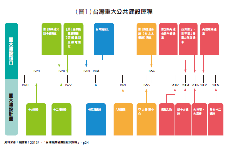 回顧我國基礎建設的發展歷程(詳見圖1),是以1974年至1979年間所進行的「十大建設」,做為我國重大公共建設計畫的開端。在十大建設中,有6項是交通運輸建設,3項是重工業建設,1項為能源項目建設,總花費估計在新台幣2,000億至3,000億之間。其中雖也有如蘇澳港此類在興建完成後,使用效率不彰的案例;但就整體而言,各項交通與工業計畫,咸論對於當時因石油危機造成的經濟不景氣,有效的提升了國內需求,也藉由十大建設中的現代化交通設施與電力提供,強化台灣產業的國際競爭力。