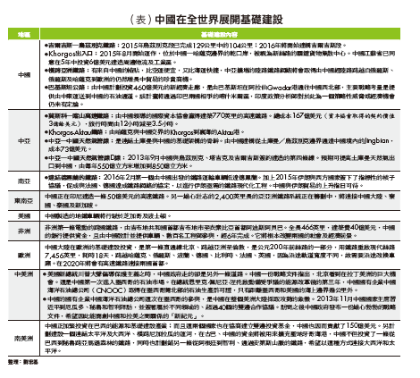 國外商業港口方面:希臘東南最大海港比雷亞斯港(其多數股權已被中國中遠集團收購);當然也包括一帶一路及其他各洲的基礎建設。中國領導的一帶一路範圍以內,及以外位於中南美洲、非洲、東亞、東南亞(姑且稱之為「一帶一路+」)的基本建設初期成本即超過9,000億美元以上,其中究竟哪些是屬於援助,哪些是屬於互利,尚待進一步釐清,但就規模及性質而言,歷史上唯一可以相比較的,可能就是二次大戰之後美國在西歐進行的馬歇爾援助計畫,當時涉及的經費是120億美元,折合現在幣值約1,200億美元。如果就涵蓋的地理區域及計畫之多元複雜,「一帶一路+」是8倍左右的規模。無疑的是,中國「一帶一路+」的雄偉工程當然是為了解決其國內的產能過剩問題;取得有可靠供給的自然資源,如石油、天然氣及其他礦產;為龐大的外匯存底(目前仍有3兆美元以上)取得遠較在西方貨幣及債券市場收益率為高的報酬。