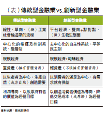 傳統金融業因為貨幣政策傳導體的角色,以及金融穩定的考慮,是被高度監管的。這對傳統金融業而言是利弊參半,弊者法遵成本高,利者是受到層層保護。但隨著消費者意識的提升及赤裸裸的經濟現實面考量,改變的時刻終究到了。扮演觸媒角色的會是區塊鏈技術,它被稱為貨幣的網際網路(internet of money)其來有自。右表列出的傳統型金融業對創新型金融業的比較,可以幫助我們對兩者未來的競合刻不容緩的進行思考。