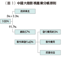 在中國大陸影視產業中,目前普遍的分帳原則是從電影票房中,先扣掉3.3%的特別營業稅以及5%的電影事業專項基金,剩餘的91.7%為可分帳票房。在此可分帳票房中,電影院拿走57%,製片方和發行方共拿走43%。在這43%中,還須扣除固定費用,例如發行代理費、營銷成本等,剩下的才是製片方和發行方共同分享的淨收益。至於具體能分到多少,由各自當初的協議及投資金額決定(詳見圖1)。
