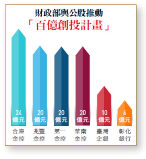 目前財政部轄下公股金控、銀行裡,共有6家有公股創投,這6家公股創投在財政部的百億創投計畫裡,已訂立具體的投資目標;對於「百億」的規模,合庫金控旗下合庫創投包辦最多額度,將投資至少24億,兆豐金、第一金、華南金等三大金控旗下創投各投資20億、彰銀及臺企銀則分別投資6億、10億,合計泛公股就有百億的陣容,再以此和民間創投業者合作,創造更多乘數效果。