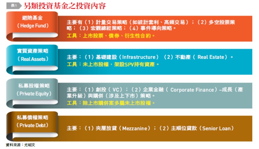 以美國市場為例,另類投資具有非公開、非傳統(不從事普通股、債與現金投資)、流動性低等特性,特定目的募集的另類投資基金(Alternative Investment Fund, AIF),多採私募管道,針對一般投資人無法取得的技術、金融工具,或市場/資本結構,最終目的仍是一致地對實體經濟有所貢獻。國際上,多數政府主權基金、有政府撥款的退休基金機構,長期持有並持續增加另類投資的部位,目的無非是希望增加投資獲利。