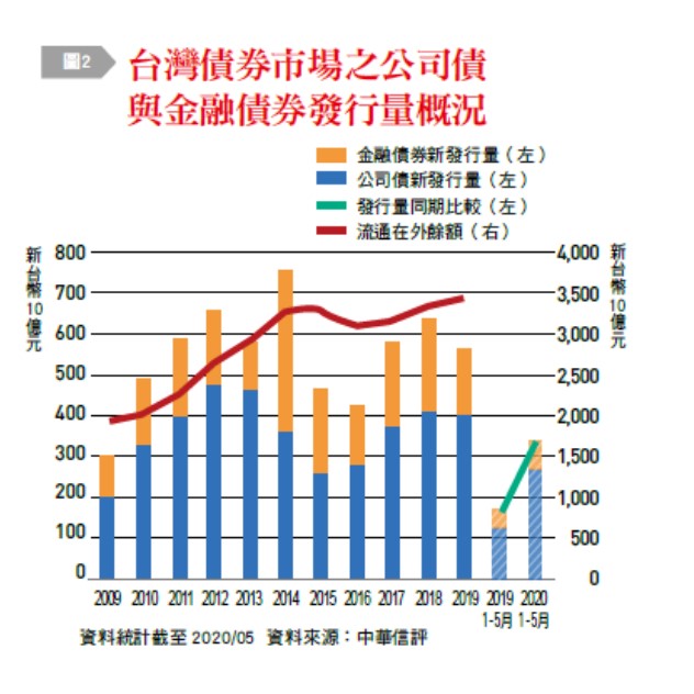中華信評指出,金融債券方面,由於國內銀行的資本適足率多已達到健全水準,2018、2019年間的發行多是到期舊券換發新券,導致整體衰退幅度約25%,隨著疫情創造出全球利率新低點,金融債券發行重拾動能;截至2020年5月底止,金融債券的發行量已達到約新台幣690億元,較去年同期成長50%〔圖2〕。