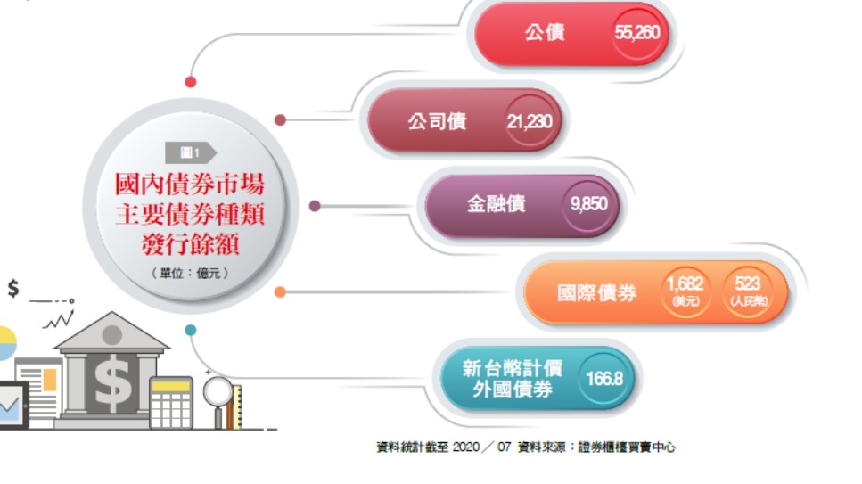 證券櫃檯買賣中心統計,截至2020年7月,債券種類及其發行餘額為,政府公債5兆5,260億元,公司債2兆1,230億元,金融債9,850億元,以及國際債券,也就是在台灣掛牌的外幣計價債券,主要有美元部位約1,682億美元、人民幣部位約523億元,加上少許澳幣和南非幣計價部位,以及新台幣計價外國債券有166.8億元左右〔圖1〕。金管會證期局副局長蔡麗玲表示,金管會歡迎各界提供健全債券市場發展的機制或商品的任何建議。
