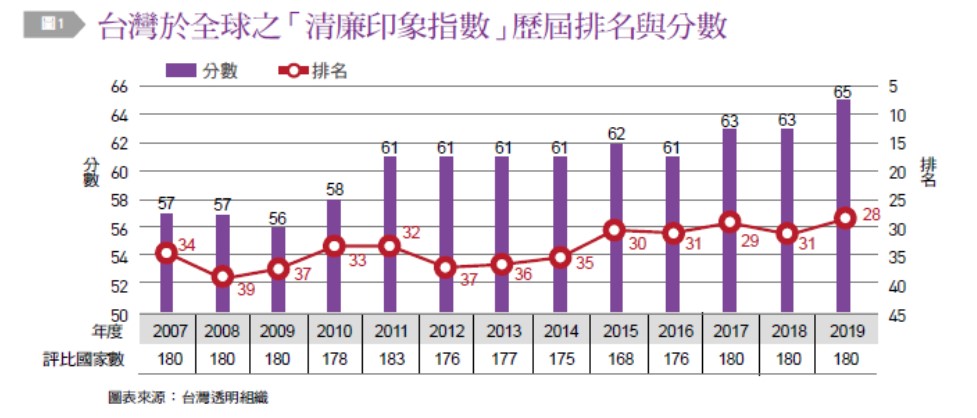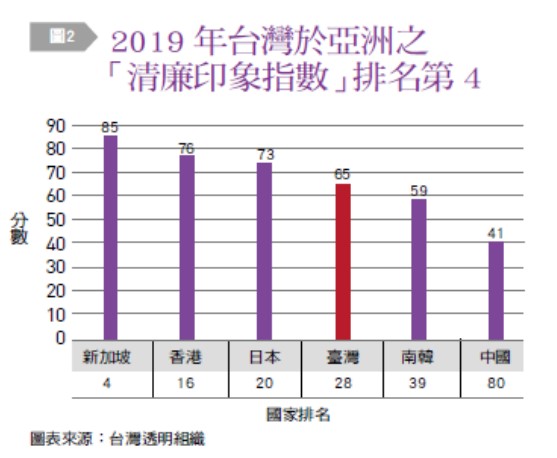 所謂「草上之風,必偃」,業界的誠信度和法遵表現,與主管機關的管理手段、執行的透徹度往往有密切關係。近年來,台灣推動的廉政建設獲得國際間的肯定。國際透明組織今年1月公布2019年清廉印象指數,台灣在全球180個國家中排名第28〔圖1〕,共拿下65分,比起2018年進步2分;在亞洲部分,台灣排名第4,位居新加坡、日本及香港之後〔圖2〕。