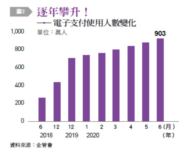 但到今年6月底止,隨著疫情得到控制,民眾消費及相關經濟活動也漸漸復甦,電子支付有不錯的表現;根據金管會統計5家專營電子支付機構及23家兼營電子支付機構,包括電子票證機構、銀行及中華郵政,使用者人數最多的是街口支付,有268萬多人,一卡通排名第二有244萬多人,其次是玉山銀行兼營的電支,使用者人數118萬人。總體使用者人數上升至903萬人,首次突破900萬人,比上月增加4.39%,比去年同期大增67.22%〔如圖2〕。在電支業務方面,6月已明顯擺脫疫情影響,包括當月交易金額、轉帳金額及儲值金額,都有明顯成長,其中當月交易金額、當月儲值金額更創新高。