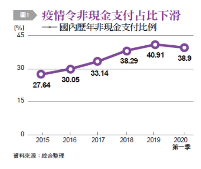 目前我國非現金支付占比雖然成長速度緩慢,但仍逐年以3%至5%的速度緩升中,終於在去年底突破40%,眼見就要達成非現金社會的理想,希望非現金支付可以達到52%的目標,卻沒想到在今年第一季受到武漢肺炎疫情的嚴重影響後出現反轉,下降到38.9%;金管會表示,今年第一季非現金支付占比出現下滑,確實是因為年初疫情衝擊,導致實體商店消費減少,雖然一般國內民生消費支出沒有下降太多,但因各國防疫嚴峻,使民眾幾乎無法出國,連帶刷卡支付旅遊團費及國外消費刷卡量幾乎呈現停滯,更別說非現金支付成長在疫情期間有重大突破〔如圖1〕。