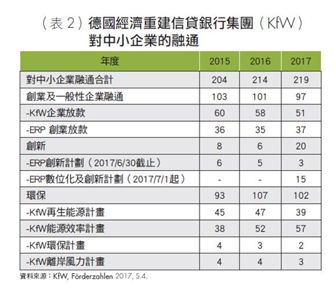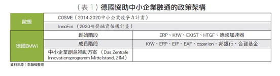 德國中小企業的融資主要由歐盟及聯邦經濟暨能源部(BMWi)主管,結合歐盟的歐洲社會基金合作,在企業創始期及茁壯期各有融通政策工具。