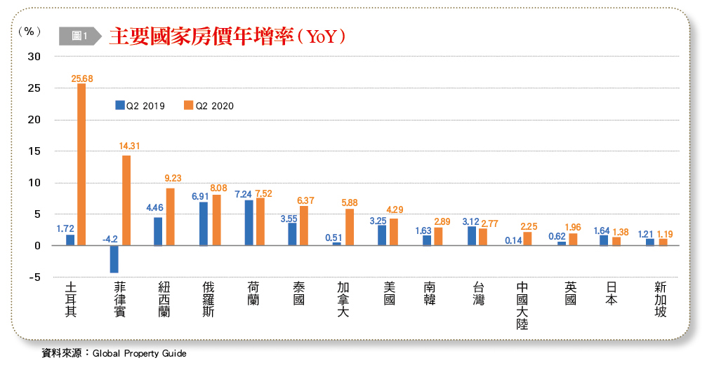自武漢肺炎疫情爆發以來,各國央行紛採激進的寬鬆貨幣政策以救市,在創造出超低利環境下,大量的資金流向商品、資本與不動產市場。因此不僅各國股市重創後快速回升,甚至迭創新高;各國不動產價格亦同樣成為寬鬆貨幣政策的最大受惠者之一,不斷攀升的房價已成為多數國家共同面臨的議題〔圖1〕。