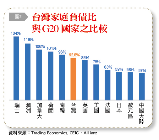 台灣家庭負債占GDP比例(Households Debt to GDP,下稱家庭負債比)高居亞洲第2,僅次於南韓,且仍逐年攀升。與G20國家相較也是前段班(第6)〔圖2〕。其中房貸占超過6成。
