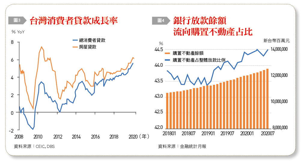 2020年7月底全體銀行放款餘額為28.1兆元,較上年同月底增6.8%。以用途別而言,購置不動產12.5兆元,占整體放款達44.6%,成長7.8%,速度是所有類型授信中最快的。觀察近3年趨勢,銀行授信朝向不動產集中化的情形似乎越來越明顯〔圖4〕。