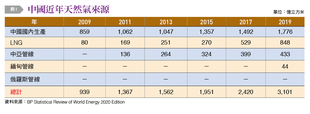 中國在2006年4月與土庫曼簽屬「長期天然氣供應協議」,興建從新疆到土庫曼的天然氣管線,與「西氣東輸」管線進行連結。這條新疆到土庫曼長達1,833公里的管線,國際上稱為「Central Asia-China Gas Pipeline」,以驚人的速度在2009年完成,始於土庫曼經烏茲別克、哈薩克,進入新疆境內,土庫曼為最主要供應國,沿途兩國也可供應部分天然氣,2019年度供應433億立方米的天然氣。有了土庫曼經驗後,中國於2010年再尋求與緬甸合建天然氣管線,從印度洋沿海到昆明、成都,最原始動機為減少對麻六甲海峽、南海的運輸依賴,但因工程造價較高,原設計1年可供應120億立方米,2019年僅供應44億立方米〔表1〕。除此之外,2006年也完成第一個液化天然氣接收站,分散供氣來源,到了2019年底已有22個天然氣接收站。