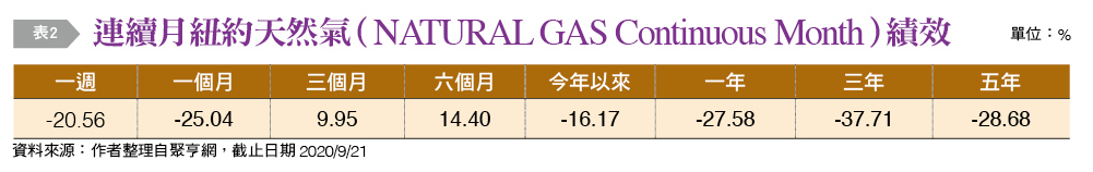 就市場資訊觀察,由於天然氣市場與能源市場有著非常緊密的聯繫,基於2020年全球經濟成長趨緩的前提,以及煤炭、核電與可再生性能源的替代效應影響下,除8月份出現局部高點外,國際天然氣價格大致呈現下跌趨勢,可見〔表2〕紐約天然氣期貨績效。影響天然氣期貨價格的因素,主要包含開採技術更新、新能源的替代效應、氣候因素與其他能源價格,其中又以原油價格最為息息相關。根據7月份全球能源監測機構(GEM)報告,全球一半的天然氣出口基礎建設前景黯淡,市場普遍因為氣候變化與疫情衝擊對天然氣市場前景感到悲觀。全球45個在建的大型液化天然氣出口項目中,至少有20個面臨融資問題而被迫停產,其中有9個位於美國,足見天然氣的前景面臨的風險正在升高。總體而言,受疫情影響,天然氣的進出口與開採受到強烈的衝擊,K線圖上的天然氣價格也形成下跌的波浪,因此就市場投資報酬與風險角度而言,天然氣的個股或期貨並非良好的投資標的。