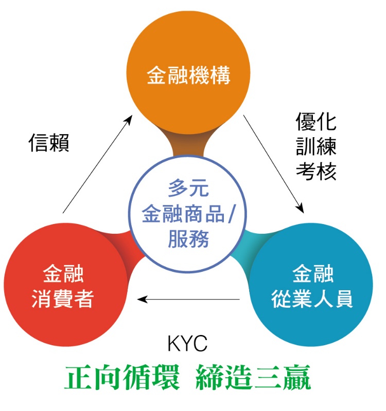 1.以客戶為中心導向,落實KYC(認識你的客戶),了解客戶真正的需求,提供完整的金融服務。同時提升金融產品研發能力,規劃符合不同投資風險屬性或不同年齡層需求的多元服務及商品。並落實KYP(認識你的商品),對客戶進行投資前的知識傳遞及商品適合度調查,與投資後的風險追蹤管理,以保障客戶權益。